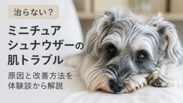 ミニチュアシュナウザーのかさぶた・かゆみが治らないと悩んでいませんか?6年間繰り返す皮膚トラブルに向き合った体験談から、原因(アレルギー・膿皮症など)と改善方法、実際に効果を感じた食事対策まで詳しく解説します。